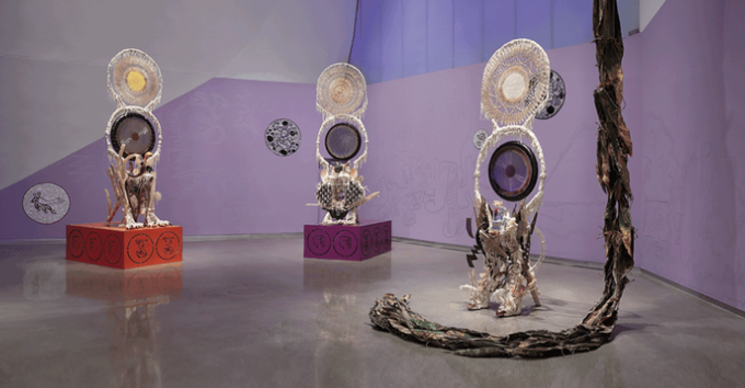 Guadalupe Maravilla believes in non-Western forms of healing including gongs and spiritual rituals. In this project, the intestines become a locus of stress and illness, echoed in the winding formal qualities of his drawing, sculpture, and performance. Bringing together themes and forms that resonate and reinforce one another across different parts of the project, Disease Thrower enacts gestures and rituals that can help heal both the human body and the social body.