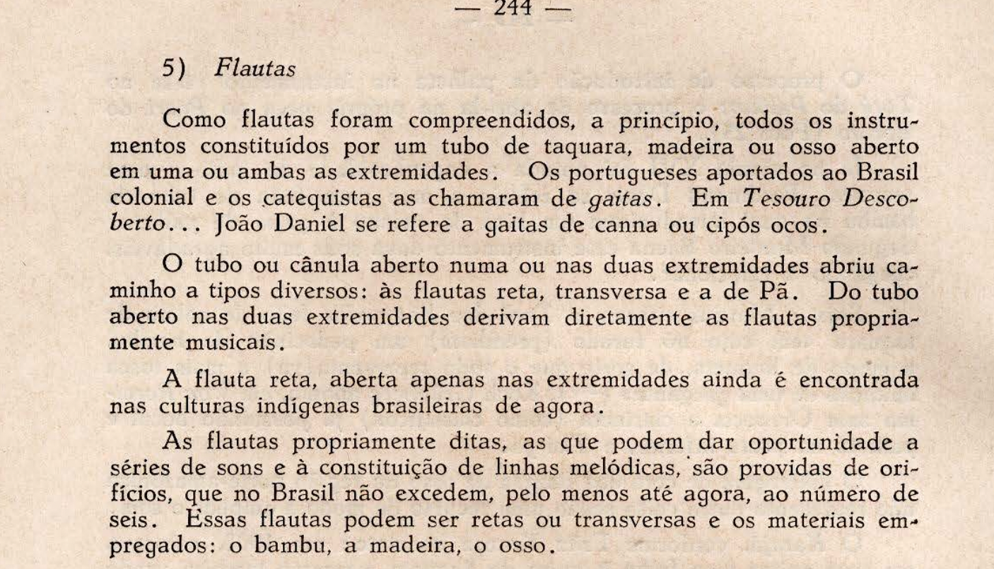 Helza Cameu, in her book Introdução ao estudo da música indígena brasileira, explains that despite the limited amount of information on colonial-era music, even though Indigenous culture today has adopted many new instruments, this does not affect its traditional culture: “The introduction of foreign instruments is still not a reason for abandoning those that are typical of their culture, for they can perfectly distinguish the traditional from the incorporated. As for music, although most information goes no further than description or personal impressions, the documents collected so far demonstrate a consistency in the formative elements of both vocal and instrumental music of the past and present.”